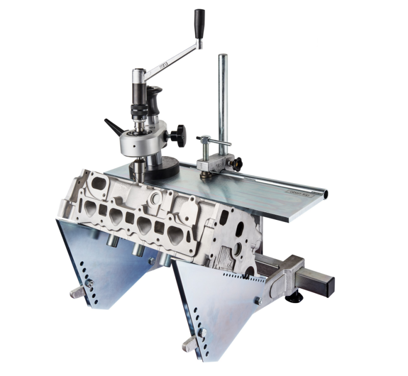 The portable VGX-21 valve seat refacing unit has been developed for the specialised petrol and diesel cylinderhead workshop. The highly accurate valve seat processing is achieved by a spherical spindle guide bearing as well as a unique hydraulic ball clamping system. A almost pressure free centering and braceless fixing of the MIRA rotary head is made possible in order to achieve precise and concentric valve seats.